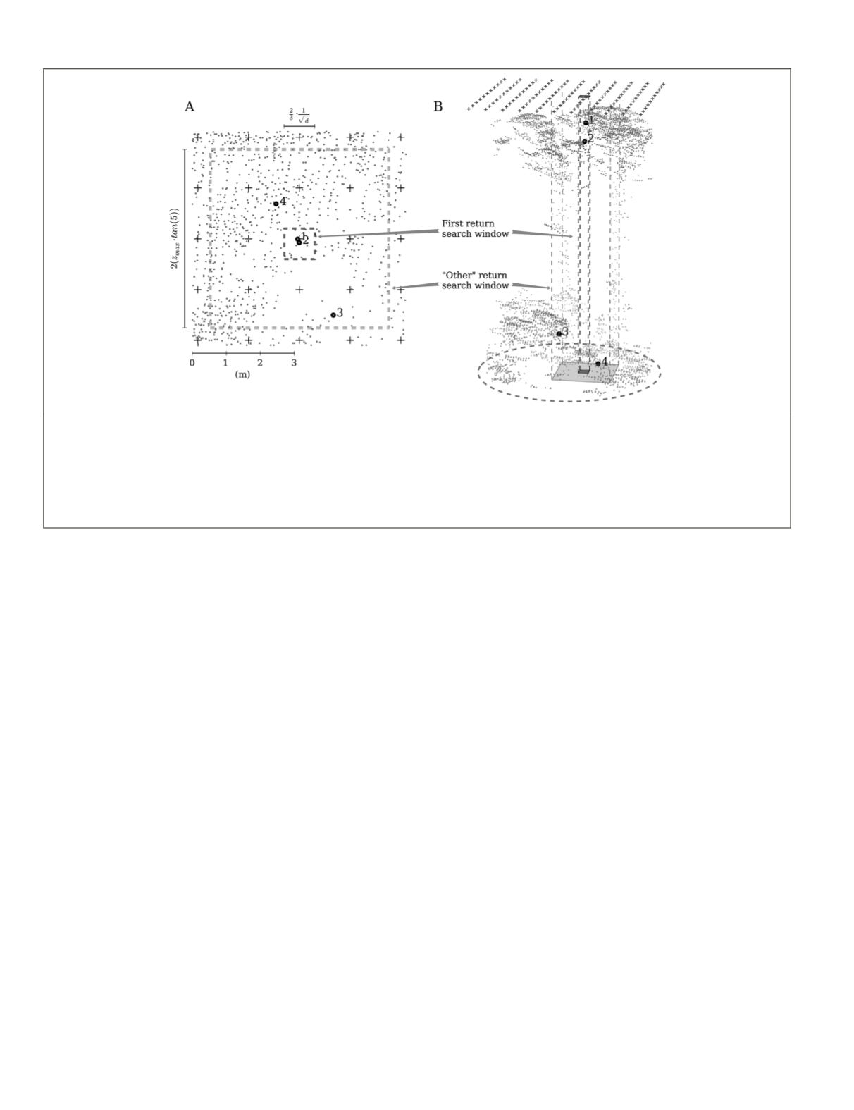 first return is selected for each grid point (+) where the ALS return with the lowest Cartesian distance is selected. Selection is restricted to