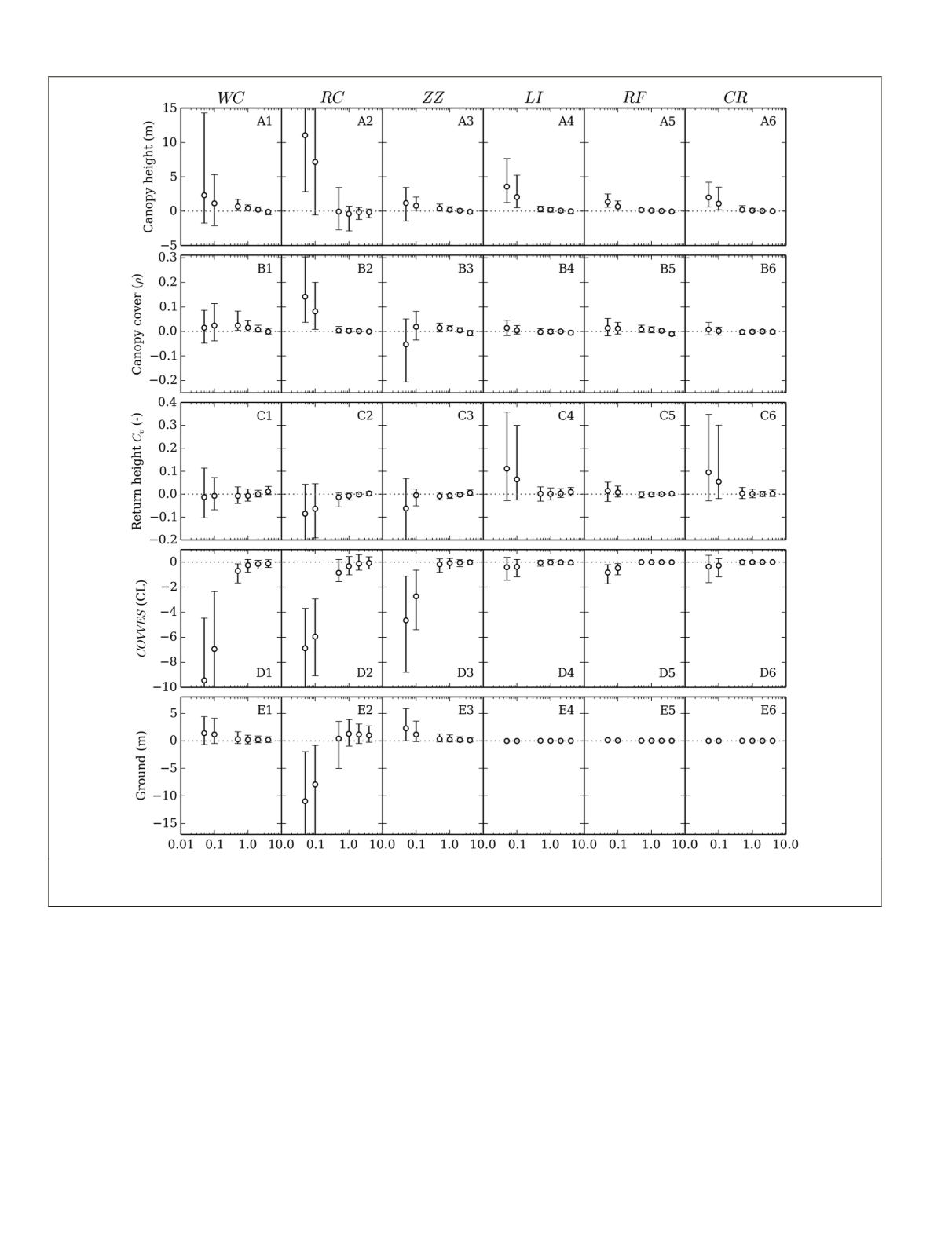 . Four metrics are used to summarize canopy structure: (A) canopy height, (B) canopy cover, (C) coefficient of variation (