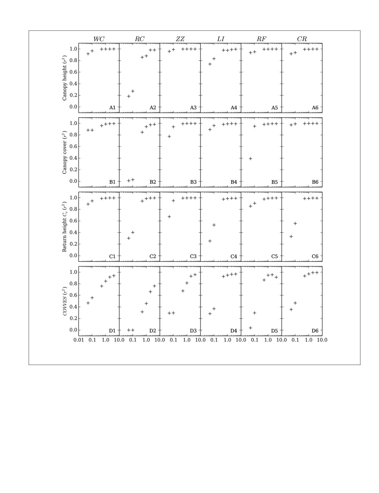 Figure 5. Coefficient of determination where the independent variable was (A) canopy height, (B) canopy cover, (C) return height coef-