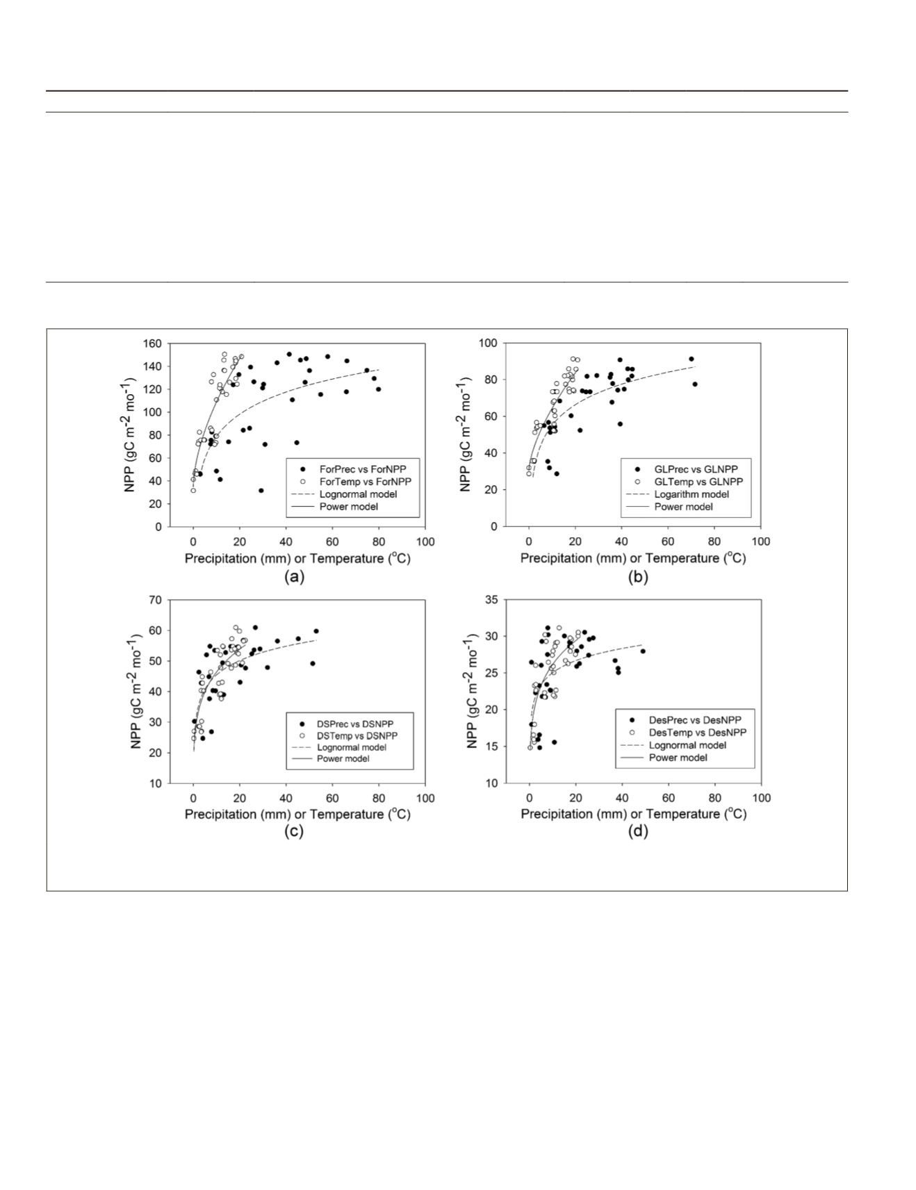 the vegetation types: (a) forest, (b) grassland, (c) desert steppe, and (d) desert in Mongolia. The dots and circles in every subfigure repre-