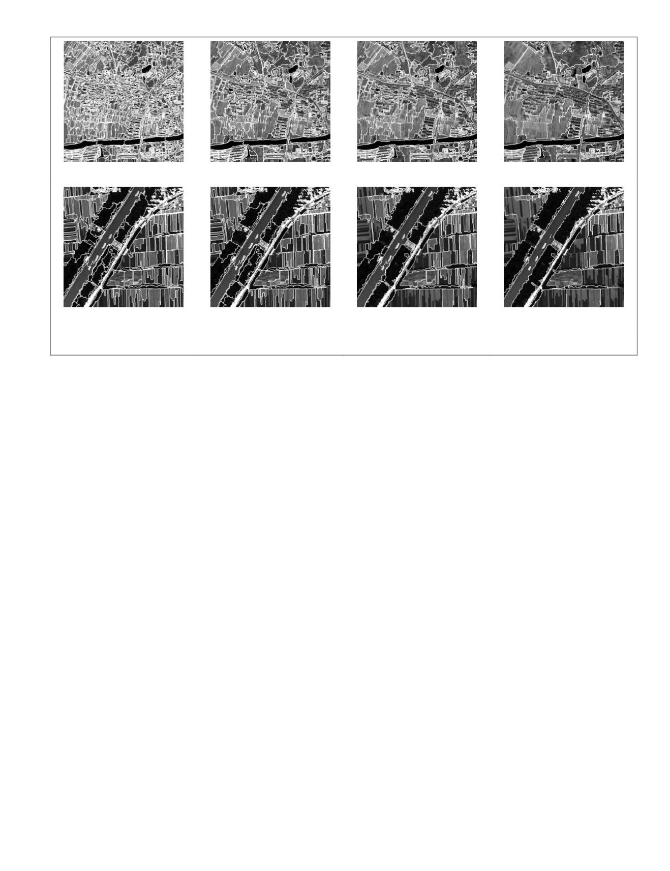Figure 9. Multi-scale segmentation results of T3 (top row) and T4 (bottom row) using LMM+AISP. The number of regions is 1174, 335,