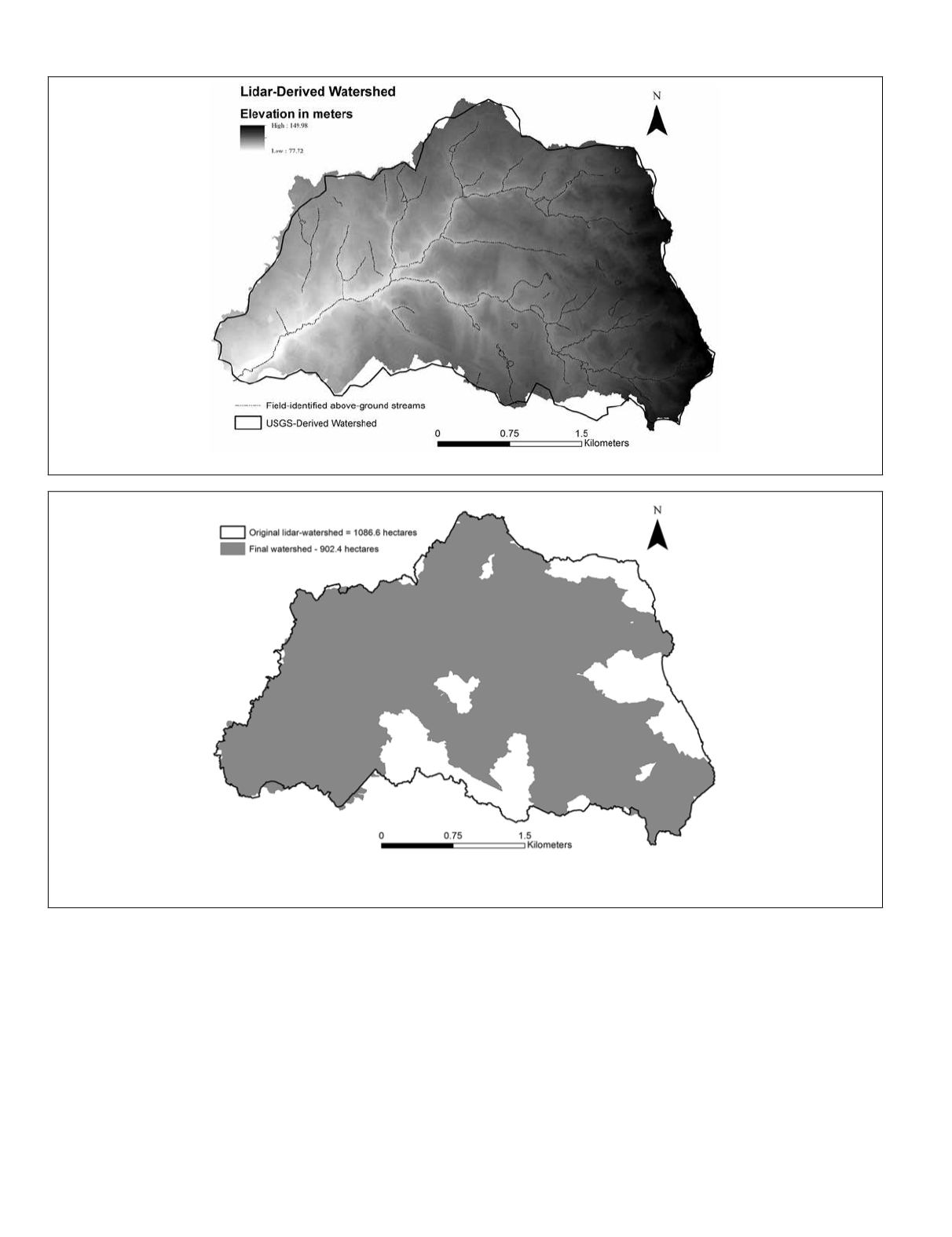 lidar-derived watershed area was 1,086.6 hectares. After add-