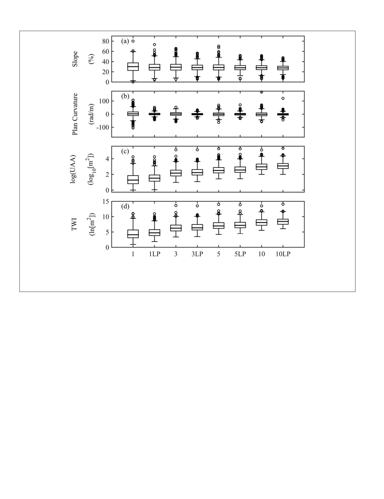 Figure 4. Box and whisker plots indicate variation in distribution of topographic metrics for